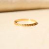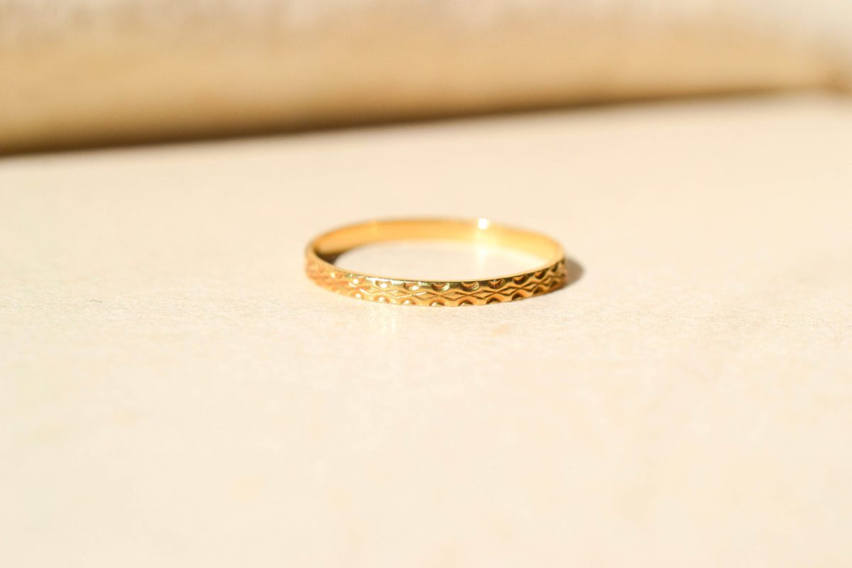 Le mot de Noir Carat : Cette bague en or jaune 18 carats revisite l’alliance classique avec une approche plus contemporaine et sculpturale. Son anneau large révèle une belle présence au doigt, tout en conservant l’élégance intemporelle propre aux bijoux en or massif. Son design se distingue par un travail de texture raffiné qui alterne surfaces polies et motifs géométriques stylisés, évoquant des chevrons ou des facettes. Ces reliefs captent la lumière sous différents angles et créent un éclat plus vivant qu’une alliance traditionnelle lisse.