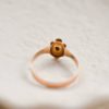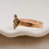 Le mot de Noir Carat: Cette bague en Or rose 18 carats séduit par son charme ancien et son élégance délicatement travaillée. La monture, réalisée en Or rose 18 carats, dévoile une patine subtile qui renforce son authenticité et son caractère historique. L’anneau, fin mais structuré, présente de délicates gravures géométriques accompagnées de motifs de palmettes sur les épaules. Ce décor ciselé apporte du relief et guide naturellement le regard vers la tête de bague. Le plateau adopte une forme stylisée, évoquant à la fois une fleur et une étoile. Au centre, une pierre verte attire la lumière par son éclat doux et profond. Elle est entourée d’une couronne de huit petites Perles, disposées comme des pétales.