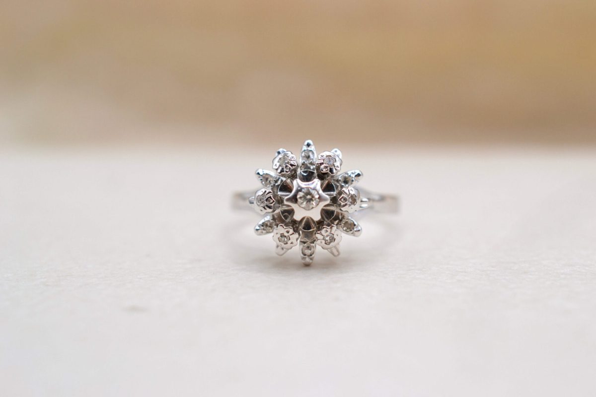 Pour aller plus loin : Les bagues florales apparaissent au début du XXᵉ siècle. À cette période, les artisans s’inspirent largement de la nature. Ainsi, ils créent des modèles aux formes organiques et délicates. Le serti clos protège la pierre centrale tout en adoucissant son allure. Quant à lui l’Or blanc est de retour avec la naissance de l’Art Déco dans les années 1920/1940.