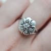 Bague style Marguerite en Or blanc 18 carats sertie de Diamants dans un décor ciselé qui forme les pétales de la fleur. Années 50/60.