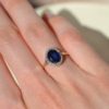 Bague en or jaune ornée d’un saphir verneuil synthétique dans un entourage en platine serti de diamants.