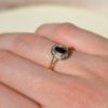 Pour aller plus loin : Ce bijou s’inspire du style des bagues Marquises ou entourages, très populaires dès le XIXe siècle. Cependant, cette pièce modernise le concept en adoptant des lignes plus épurées, typiques du milieu du XXe siècle. L’utilisation du saphir en pierre centrale fait écho à une longue tradition, car cette gemme symbolisait alors la sagesse et la fidélité. Par ailleurs, le poinçon tête d’aigle garantit une fabrication française en Or 750/1000. Enfin, cette technique d’entourage permet de donner plus de prestance à la pierre centrale tout en créant une structure joaillière cohérente et élégante.