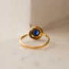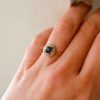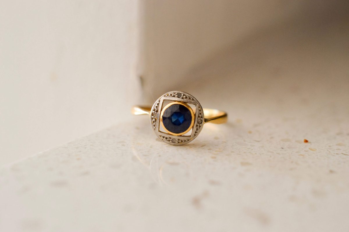 Pour aller plus loin: Cette bague reprend les grands principes esthétiques de l’Art Déco et s’inspire de ses codes. Elle exprime une géométrie rigoureuse, une symétrie parfaite et une association de matériaux contrastés. Ce style, qui apparaît dans les années 1920-1930, rompt avec les formes organiques de l’Art Nouveau. Depuis toujours, on associe le saphir, pierre centrale de cette création, à la sagesse, à la vérité et à la protection. Au-delà de son esthétique, ce bijou incarne également une dimension symbolique forte. Le cercle, forme sans début ni fin, évoque l’éternité et l’unité, tandis que le carré représente la stabilité et l’ancrage.