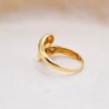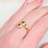 Le mot de Noir Carat: Cette bague serpent en Or jaune 18 carats séduit par son design enveloppant et son caractère affirmé. Les deux têtes de serpent se croisent avec élégance dans un mouvement fluide, créant un effet « toi et moi » à la fois symbolique et visuellement captivant. Le travail du métal, poli miroir, accentue les courbes du bijou et reflète la lumière avec intensité. Chaque tête se pare de Rubis, taillés en forme carrée et sertis avec précision, tandis que des touches de Saphir bleu et d’Oxyde blanc viennent rythmer les flancs, créant un contraste riche et sophistiqué. De petits Diamants figurent les yeux, apportant éclat et vivacité à l’ensemble.
