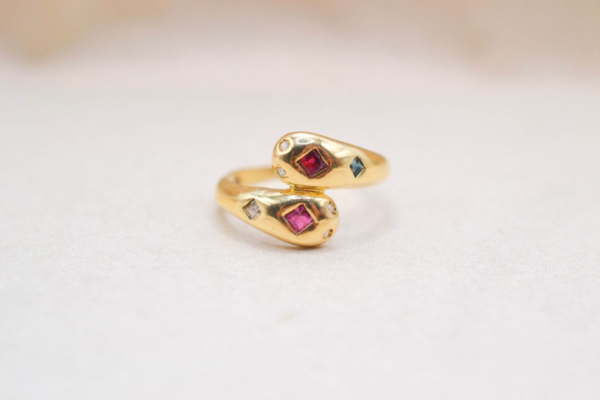 Bague serpent en Or jaune 18 Carats ornée de Diamants, Saphir, Rubis et Oxydes
